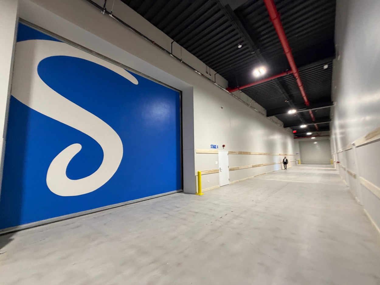 On a tour of the facility, Hudson Pacific Properties’ Sean Griffin pointed out another tell that this wasn’t a warehouse conversion: the internal corridors are so wide “you can actually drive an SUV up and down here if you need to” — a practical detail for everything from equipment moves to filming car commercials indoors.