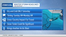 What to KnowA whopper of a winter storm is set to impact a large chunk of the U.S. – from Texas to the East Coast – this weekend.  It’s unclear this far in advance just how much we might get.  A northern track means the low-pressure system will be closer to the tri-state and snow is more likely. A more southern track would send the bulk of the snow well to our south.We are confident that this storm will track south of New York City, so within the tri-state, Central and South Jersey are most likely to see heavy snow. The Hudson Valley is least likely to see it.Meanwhile, the dangerous cold continues on Wednesday. And the weekend will be worse. Brutal cold sticks around all next week.