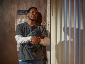 At the center of the infestation is Carrie Coon, delivering a performance so raw and emotionally catastrophic that a Tony nomination feels inevitable—if only for a single, shattering scream that lands like the sound of humanity realizing it may be the problem. Emmy and Tony nominee (The White Lotus, The Gilded Age), Coon inhabits Agnes, a freebasing addict whose already fragile life begins to unravel when she meets Peter, played with hypnotic intensity by Namir Smallwood.