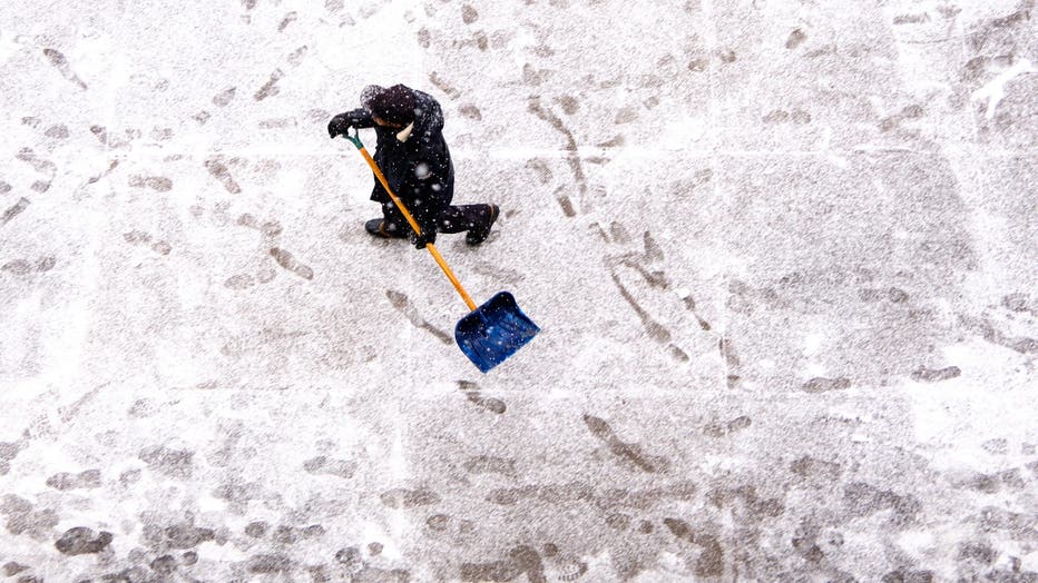 TOPSHOT – A man shovels the snow in the Hamilton Heights neighborhood in the Manhattan borough of New York City on December 14, 2025. (Photo by CHARLY TRIBALLEAU / AFP via Getty Images)