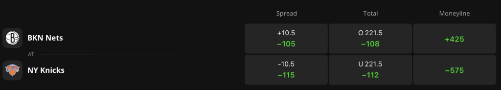 Looking at the odds for tonight, the Knicks enter as 10.5-point favorites and hold -575 odds on the Moneyline on DraftKings Sportsbook. The Nets hold +425 odds of winning outright with the game total set at 221.5 points.