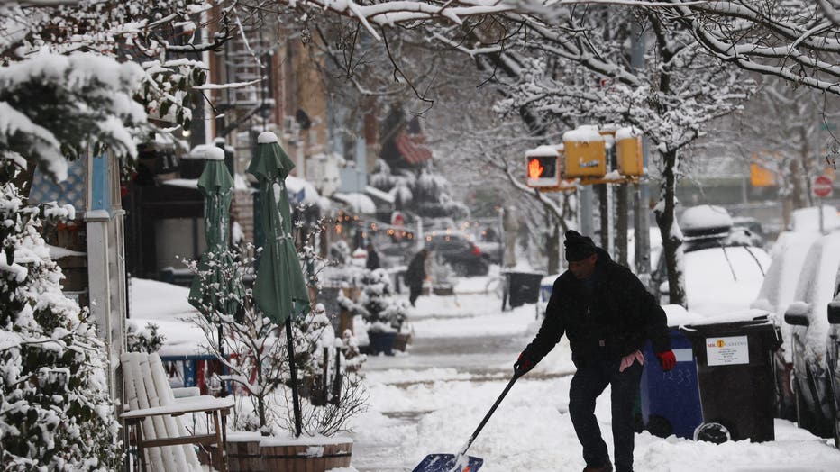 NEW YORK CITY – DECEMBER 27: A man shovels snow in Brooklyn after an overnight storm on December 27, 2025 in New York City. The New York City metro area received over 4 inches of snow, the first time the city had recorded over 4 inches since a winter
