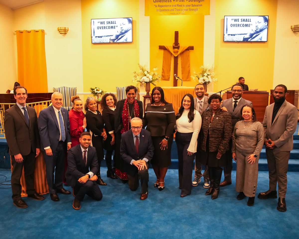 Senator Chuck Schumer (kneeling, center) was in attendance for the event. Photo courtesy of the Office of Bronx Borough President Vanessa L. Gibson