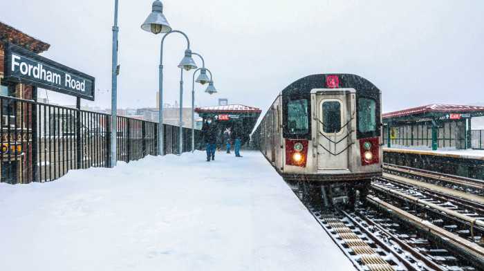 The 4 train pulls into a snowy Fordham Road station. Photo by Adrian Childress