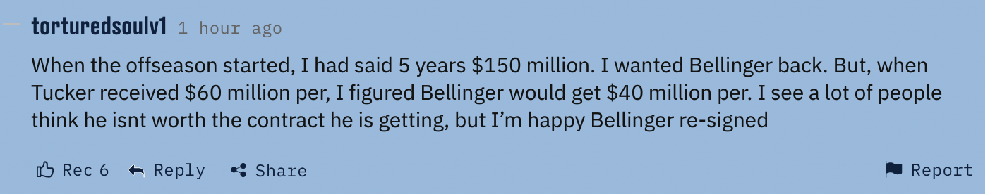Oh, yeah, the crowd didn’t go wild because it’s Bellinger. Don’t get me wrong, I like the guy, think he’s a solid player, and am glad he’s back. But, much like these two commenters (and many others), I’m simply happy that I won’t be writing up any more Around the Empire posts trying to come up with yet another pun saying that the Yankees are still daring Bellinger to accept their contract.