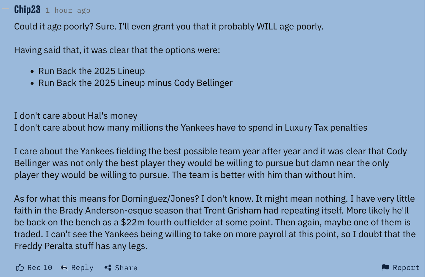 Still others, in classic Pinstripe Alley fashion, have already put Bellinger in the rearview mirror and have begun to ask the Bartletian question, “What’s next?”