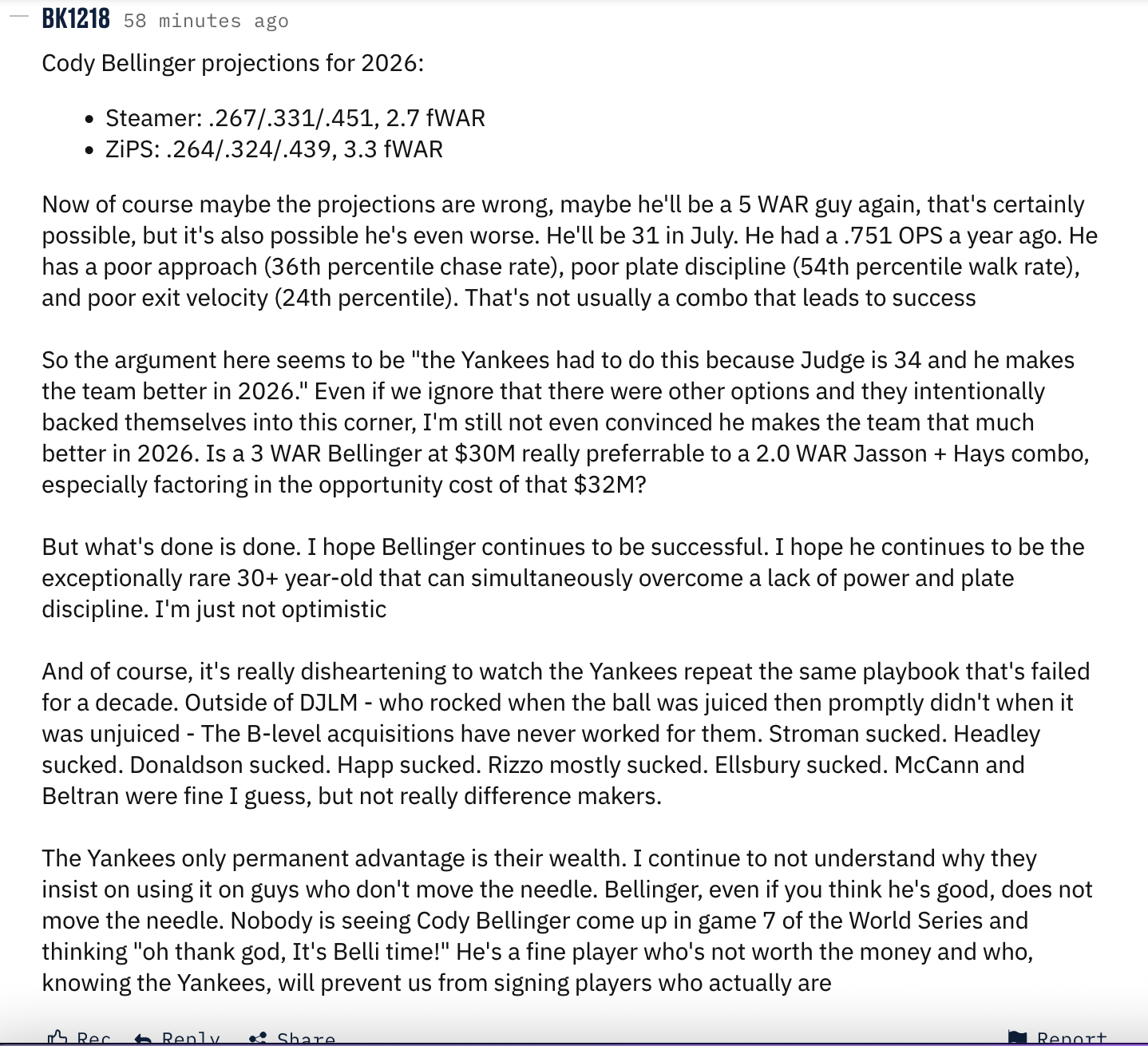 And so, after all this, I return the question to you, dear readers. What are your thoughts on the Yankees’ decision to finally get down on one knee and ask Bellinger to be their left fielder for 2026 — or perhaps, more accurately, on Bellinger finally saying yes?