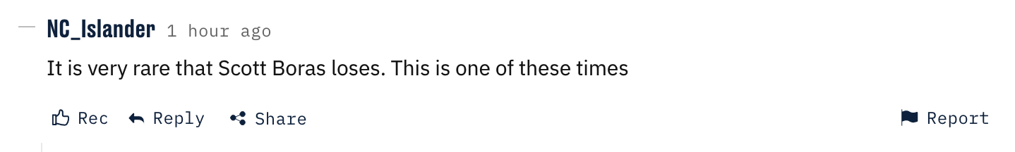 Oh, and one commenter directly expressed joy that Scott Boras failed to get his client a seven-year deal, although I argue with their notion that Boras rarely loses these days. See, for example: Gerrit Cole’s opt-out last winter, Jordan Montgomery’s failed free agent market, Alex Bregman’s free agency last year, Carlos Correa’s free agency a few years back; basically, anybody not at the extreme top of the market has had a more difficult free agency that they anticipated.
