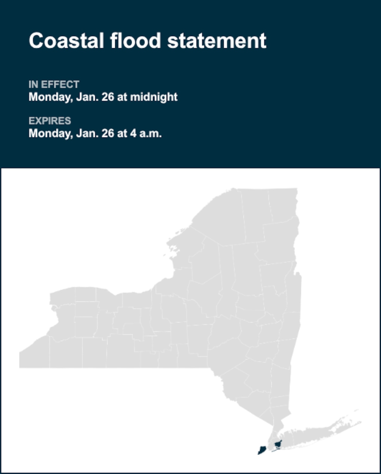 A coastal flood statement was released by the National Weather Service on Sunday at 3:15 p.m. valid for Monday between midnight and 4 a.m. for Staten Island and Queens.