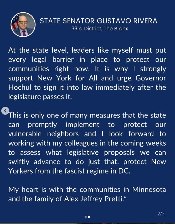 State Sen. Gustavo Rivera (S.D. 33) issued a statement the same day (attached) condemning Pretti’s death and calling for the abolition of ICE, while other elected officials, including Rep. Alexandria Ocasio-Cortez (NY-14), and U.S. Senate Minority Leader Chuck Schumer have sought to stop the ongoing federal funding of ICE in efforts to restrain its power. Assemblyman Jeffrey Dinowitz (A.D. 81) also issued a statement (attached) on Monday, Jan. 26, condemning the killing of Pretti.