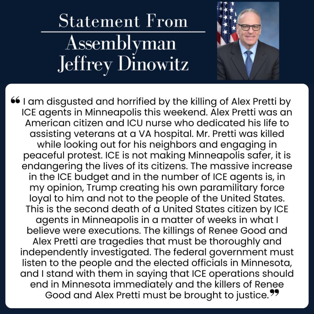 STATEMENT BY ASSEMBLYMAN Assemblyman Jeffrey Dinowitz (A.D. 81) dated Monday, Jan. 26, 2026, on the killing of Minnesota resident and ICU nurse, Alex Pretti, by federal agents on Saturday, Jan. 24, 2026.
