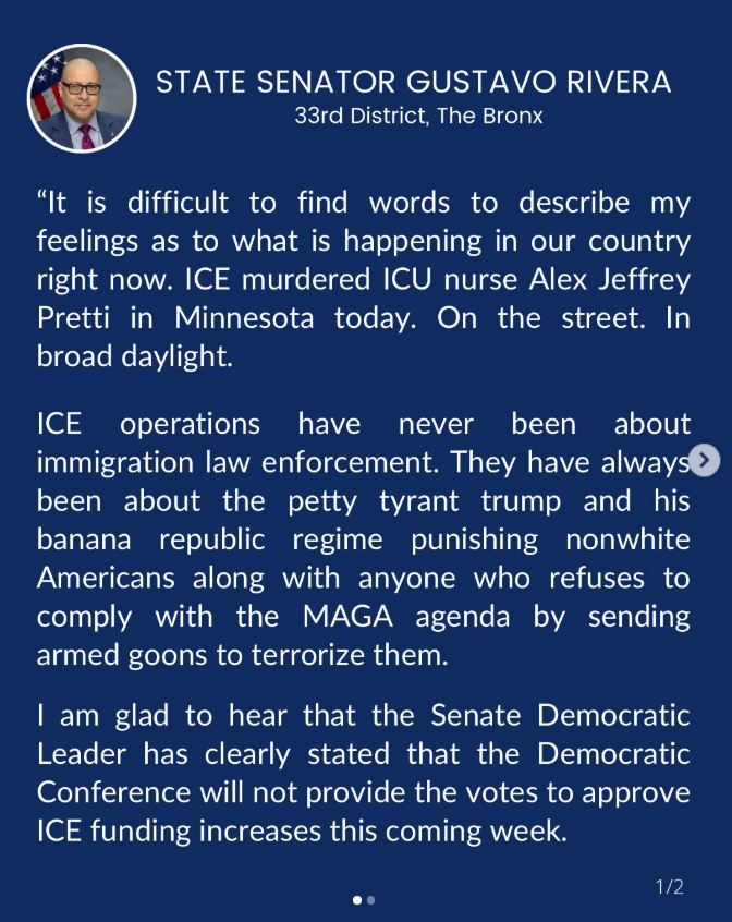 STATEMENT BY STATE Sen. Gustavo Rivera (S.D. 33) on Saturday, Jan. 24, 2026, on the killing of Minnesota resident and ICU nurse, Alex Pretti, by federal agents earlier that day, Part I.