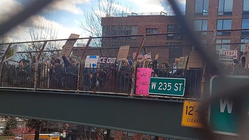 DEMONSTRATORS PACK A highway overpass over the Henry Hudson Parkway in Riverdale during a second “No Kings Day” rally on Sunday, Jan. 11, 2026.