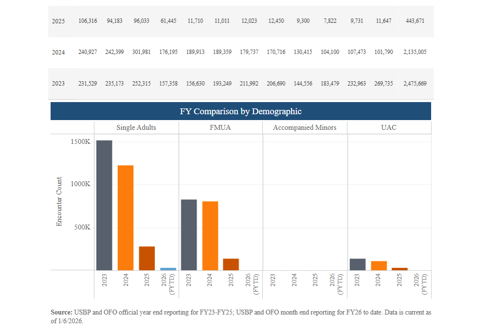 Southwest Land Border Encounters Chart I – Demographics for U.S. Border Patrol (USBP) and Office of Field Operations (OFO) include Accompanied Minors (AM), Individuals in a Family Unit (FMUA), Single Adults and Unaccompanied Alien Children (UAC)