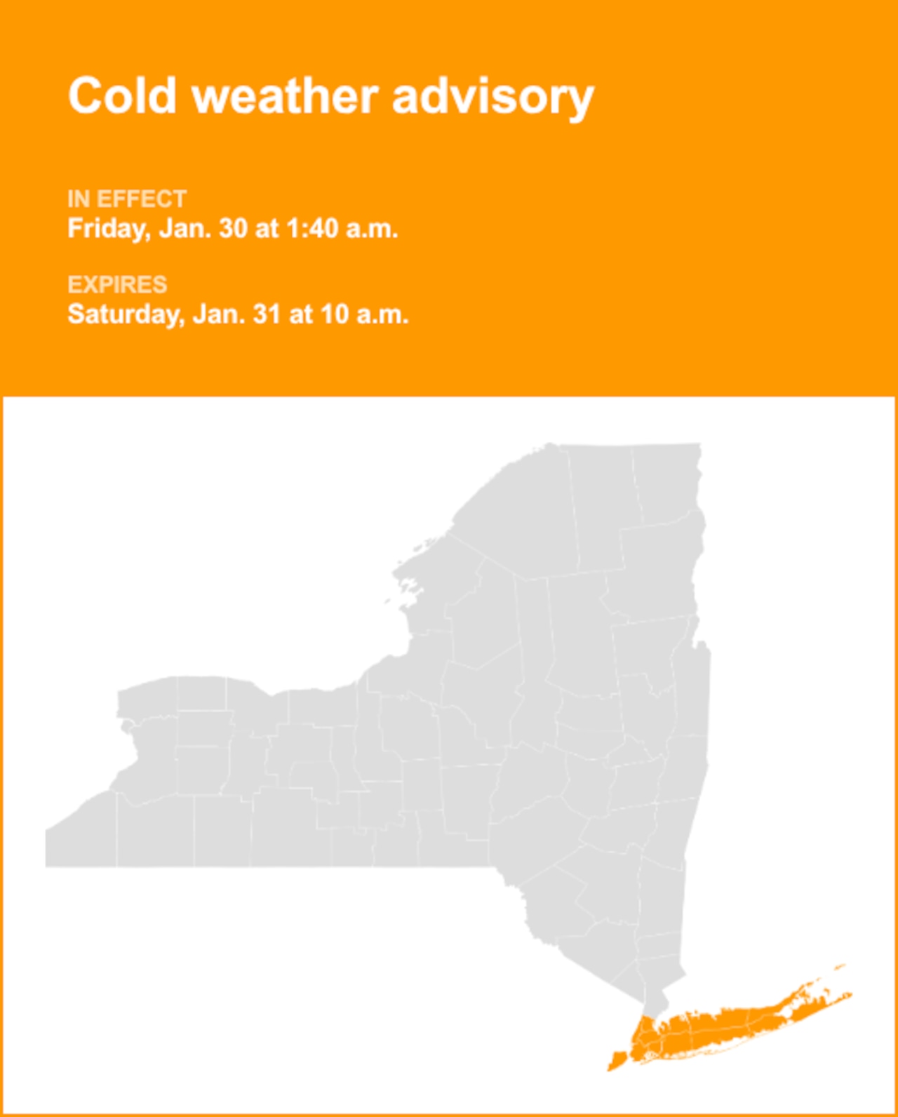 A cold weather advisory was issued by the National Weather Service on Friday at 1:40 a.m. in effect until Saturday at 10 a.m. for Manhattan, the Bronx, Staten Island, Brooklyn and Queens as well as Suffolk and Nassau counties.