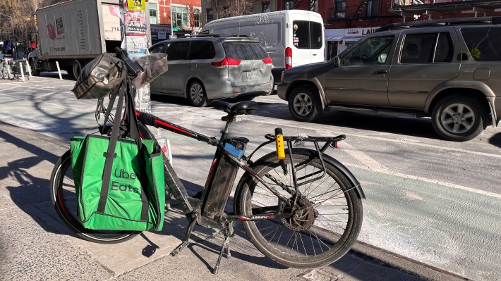A delivery worker in the East Village parks his bike with an UberEats insulated bag. Photo: Sophia Lebowitz