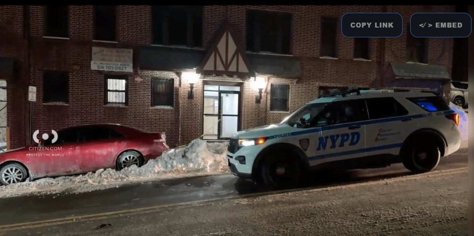 AN NYPD POLICE vehicle is seen in snowy conditions in the vicinity of 90 Caryle Avenue in Yonkers on Thursday night, Jan. 29, 2026, after they were alerted to a report of a man who had been lying on the road at West 262nd Street and Broadway in the Mosholu / Riverdale section of The Bronx and was later dragged under a car 0.4 miles as far as Yonkers, where he was transported to Jacobi Medical Center in The Bronx in critical condition.