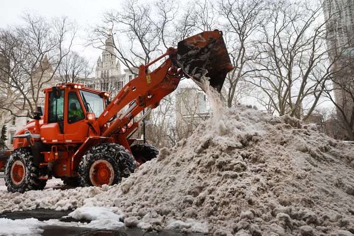 It’s been a week since a foot of snow fell on the city, and what was once fluff quickly turned into slush and has now hardened into ice. A string of below-freezing temperatures, with no real sign of a defrost coming, means things are likely to stay this way for a while. And so we’ve adapted to the new geography of a haphazardly shoveled and plowed landscape: Pedestrians learned to walk in single-file lines, supers put out the trash on top of piles of snow, bus riders became mountain climbers, and everyone got mad at one another for the uncleared crosswalks. Some older and disabled New Yorkers have been left stranded at home. Stroller navigation is a nightmare. (The sidewalk, including the curb cut, is considered the responsibility of the property owner, while the road up to the curb cut is the Department of Sanitation’s domain.) Cars remain buried, and biking is a brave (and, often, poorly compensated gig-working) person’s game. Slowly things are getting cleared. The city deployed gigantic mesmerizing snow-melters because without them, in the acting Sanitation commissioner’s own words, the snow is “not going to go away anywhere anytime soon.”