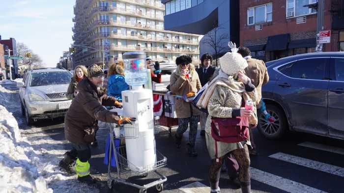 Two members of the “Costume Cult” team, dressed as a Throat Goat and a Party Rat, told Brooklyn Paper they were thrilled to be participating in their first-ever Idiotarod. Members of the city’s Department of “Inebriation” rolled out a cart modeled after a DSNY truck, stocked with bottles of liquor. A group aptly named the “Hot Tub Crime Machine” found ways to stay warm in 10 degree weather.