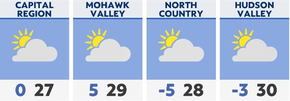 Tonight will be another frigid night with lows in many spots dropping below zero. Tuesday morning sun will give way to afternoon clouds and perhaps a few flurries across the North Country. Highs will range from the mid 20s to around 30. Wednesday will feature clearing skies and chilly temperatures with highs in the mid to upper 20s.