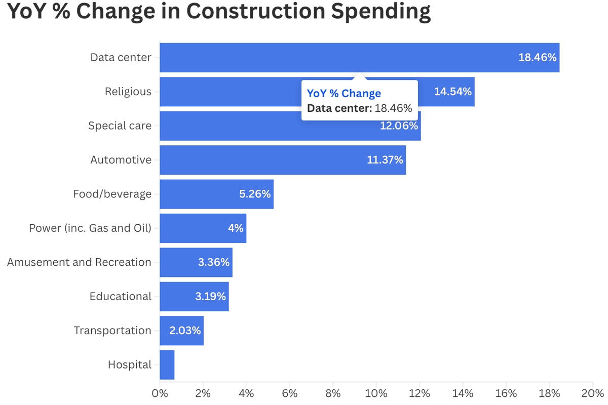 As the rise of artificial intelligence accelerates infrastructure and energy needs, data centers continue to gain ground in construction spending.