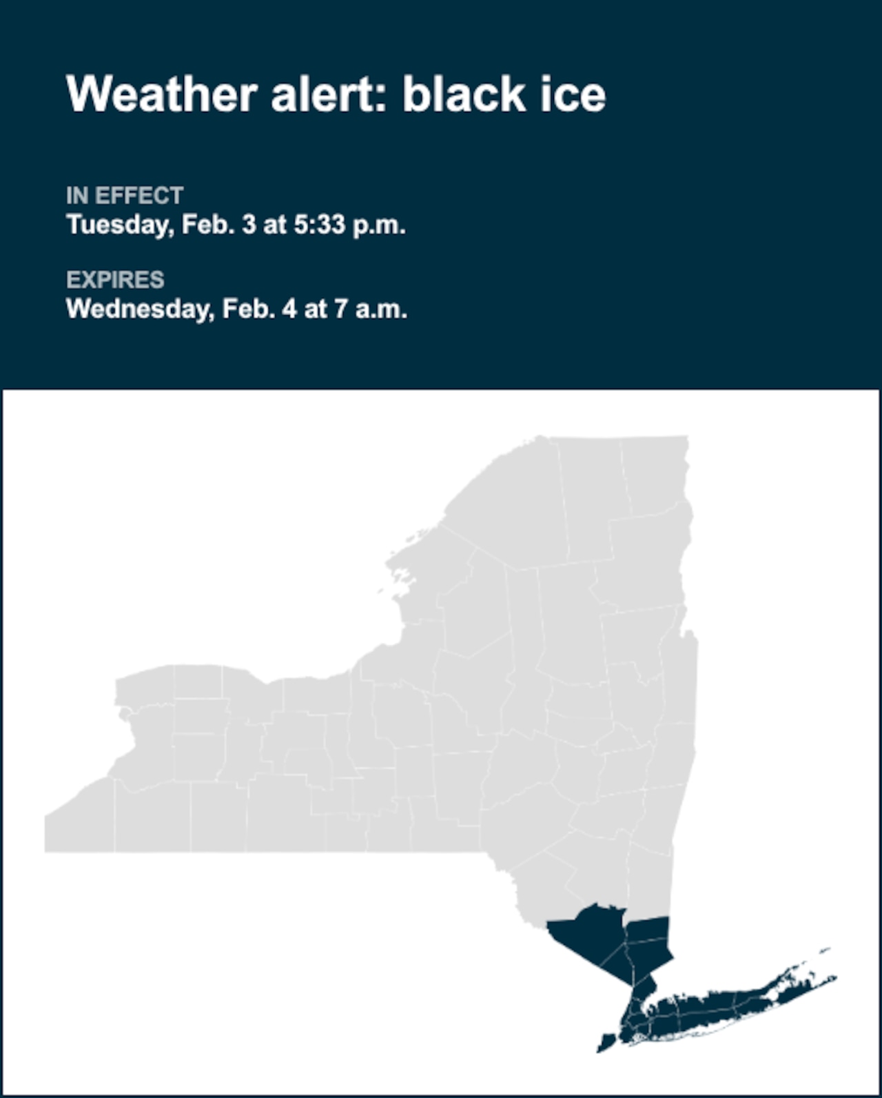 The National Weather Service issued a weather alert at 5:33 p.m. on Tuesday for black ice until Wednesday at 7 a.m. for Manhattan, the Bronx, Staten Island, Brooklyn and Queens as well as Orange, Putnam, Rockland, Westchester, Suffolk and Nassau counties.