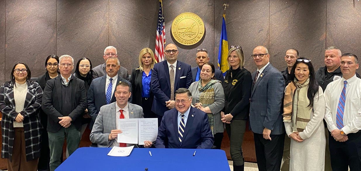 Suffolk County Legislator Chad Lennon (seated left) was joined by County Executive Ed Romaine, colleagues, law enforcement, and advocates after Lennon’s bill was signed into law, strengthening oversight of hotels and motels in Suffolk County to combat human trafficking. A press conference was held at the William H. Rogers Legislative Building on Monday, February 2. (courtesy office of Legislator Chad Lennon)