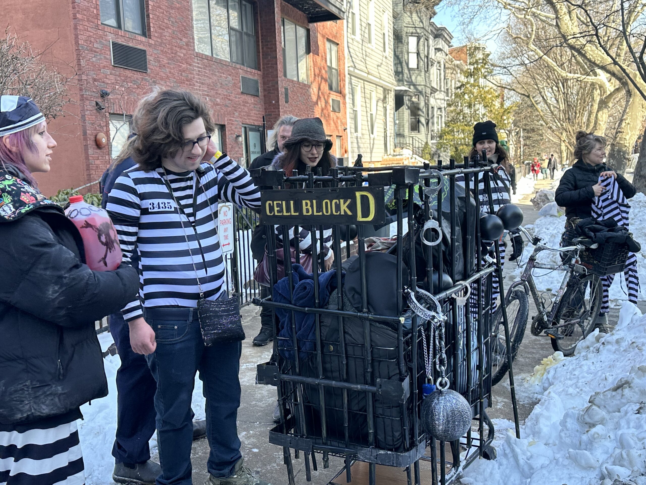 Rachel Sander, 38, from the Upper West Side, participated for her first time with Team In-Cart-Cerated. She said, “I am such a normie but my friend Catherine who I do bike stuff with asked me to help and participate. I didn’t realize how it would be. But it’s been a blast. I saw three or four people I haven’t seen in years. Now I feel like this is a real in person non-virtual way to meet real people. It’s human connection. We had a prison guard and everyone else was in jail uniforms. Our cart looks like a prison. The warden was in the cart, and we broke free and flipped the switch. We will show the man!”