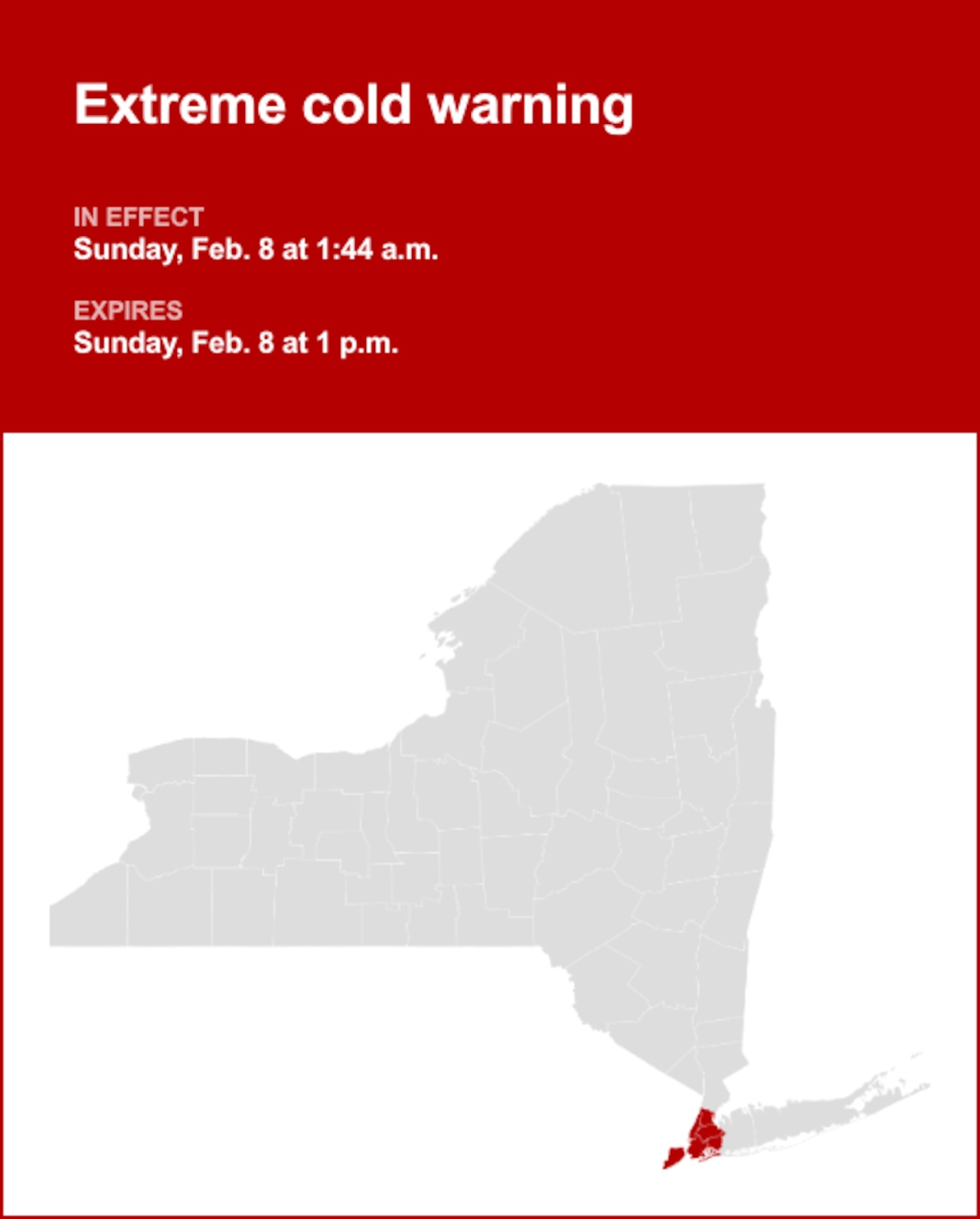 On Sunday at 1:44 a.m. the National Weather Service issued an extreme cold warning in effect until 1 p.m. for Manhattan, the Bronx, Staten Island, Brooklyn and Queens.