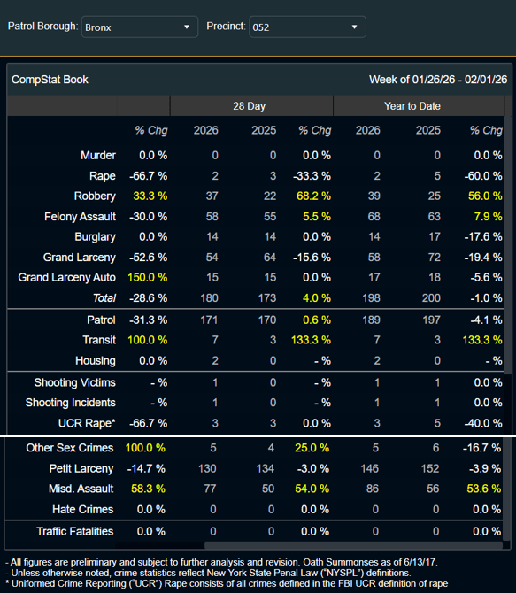 MAJOR CRIME STATISTICS for the 52nd Precinct for the 28-day period ending Feb. 1, 2026, compared to the same timeframe last year (left), and year-to-date major crime statistics for the 52nd Precinct as of Feb. 1, 2026, compared to last year (right). This precinct covers some or all of Bedford Park, Fordham, Kingsbridge, Norwood, Bronx Park, and University Heights.