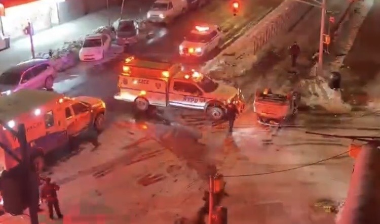 EMS/FDNY AND polcie units are seen close to an overturned vehicle as pedestrians take in the scene at East Gun Hill Road and Kings College Place in Norwood in the early hours of Sunday, Feb. 8, 2026, after a vehicle overturned on East Gunhill Road.