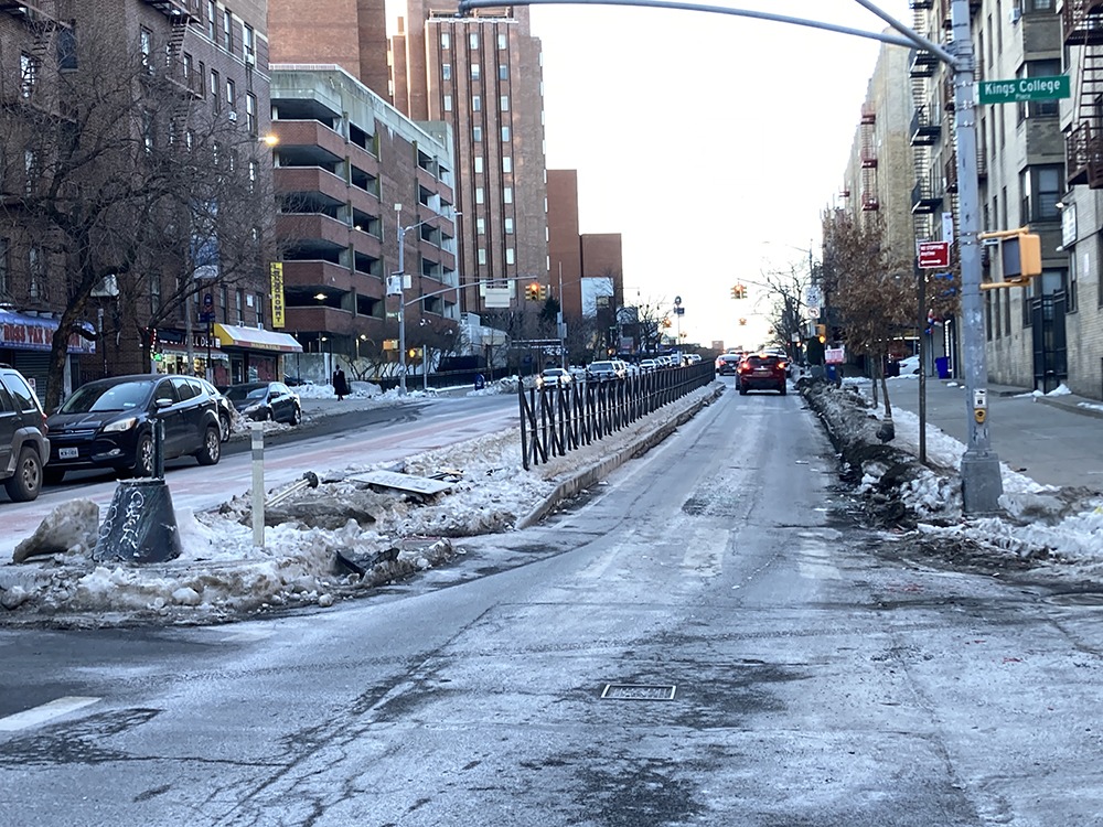 THE SITE OF a single vehicle, early morning car accident that took place on Sunday, Feb. 8, 2026, at 325 East Gunhill Road in the Norwood section of The Bronx as seen later on Sunday afternoon. The impacted vehicle was seen in the early hours of Sunday morning overturned on the side of the street where traffic is moving up an incline as seen in the attached photo. It’s not yet known in which direction the vehicle was moving at the time of the accident.