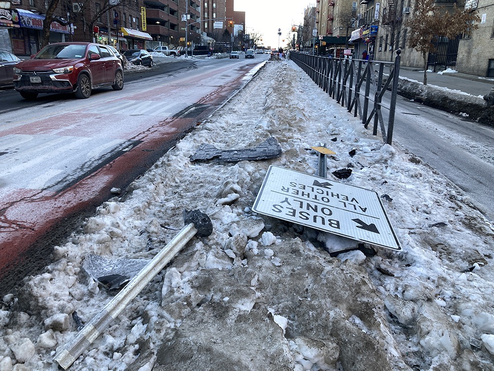 AT THE SITE of a single vehicle, early morning car accident that took place on Sunday, Feb. 8, 2026, at 325 East Gunhill Road in the Norwood section of The Bronx, a street sign is seen toppled over later on Sunday afternoon.