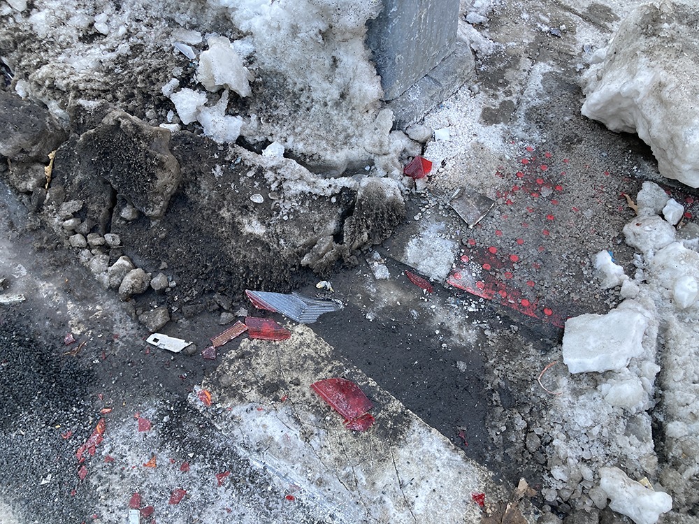 AT THE SITE of a single vehicle, early morning car accident that took place on Sunday, Feb. 8, 2026, at 325 East Gunhill Road in the Norwood section of The Bronx, debris and glass was seen later on Sunday afternoon.