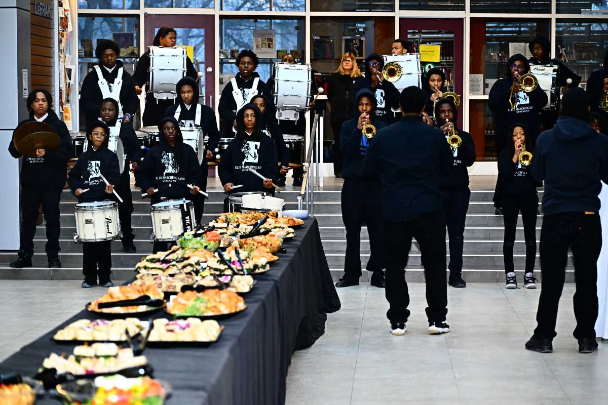 The Elite Marching Band of Queens performs for guests as they grab food and light refreshments after the inauguration ceremony.