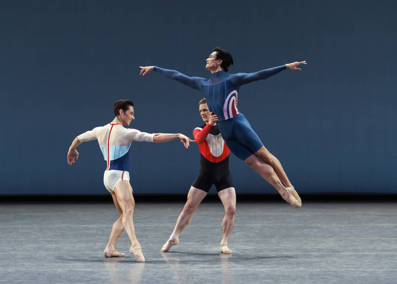 Roman Mejia, Daniel Ulbricht, and Chun Wai Chan in Justin Peck’s The Wind-Up. Photo Erin Baiano