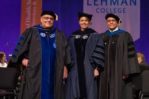Mayra Linares-García (center) on stage with Lehman President Fernando Delgado (right) and Provost Jorge Silva-Puras.