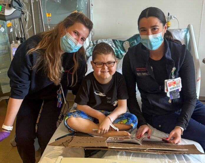 Logan Coyle, 9 years old, center, poses for a photo with two of his primary nurses, Morgan Bieler, left, and Mychala Coughlin in his room at NewYork Presbyterian Hospital, Nov. 5, 2025, in New York. (Jeffrey Coyle via AP)