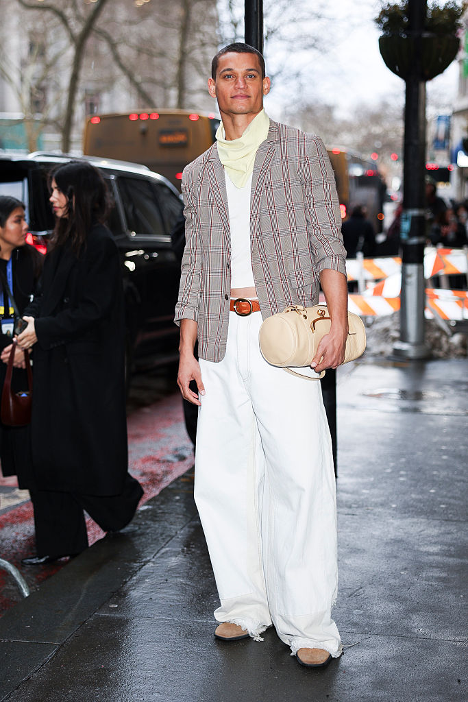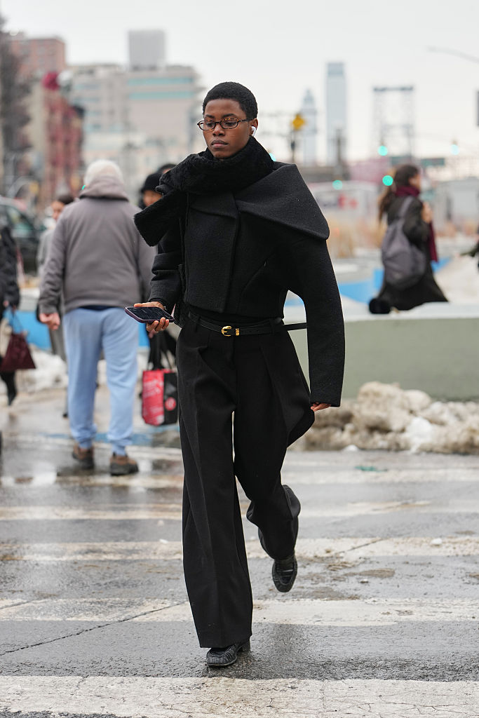 You can never go wrong in black wool. From the coat to the wide leg pants, this all-black look spotted outside of the Proenza Schouler show on Feb. 11.