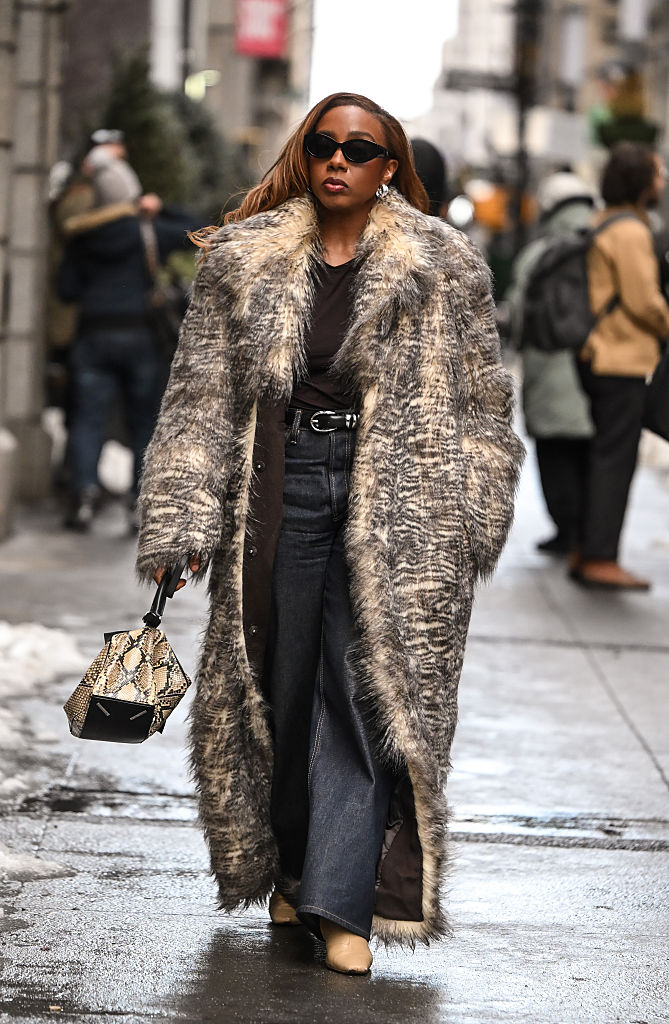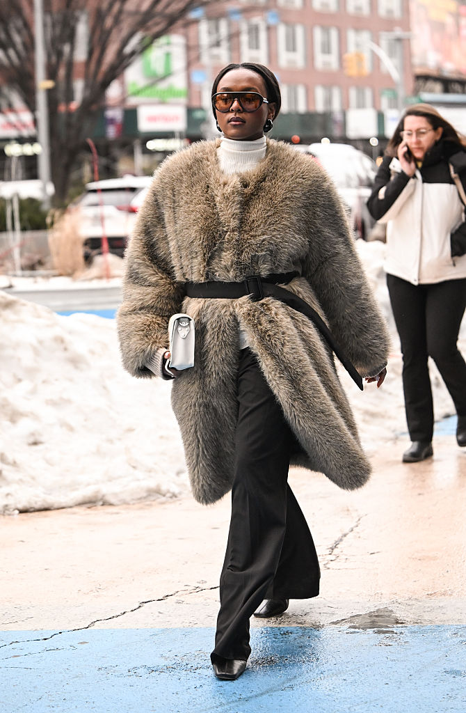Lindsay Peoples Wagner kept warm outside the Coach show in a beautiful floor-length faux fur coat over dark denim.