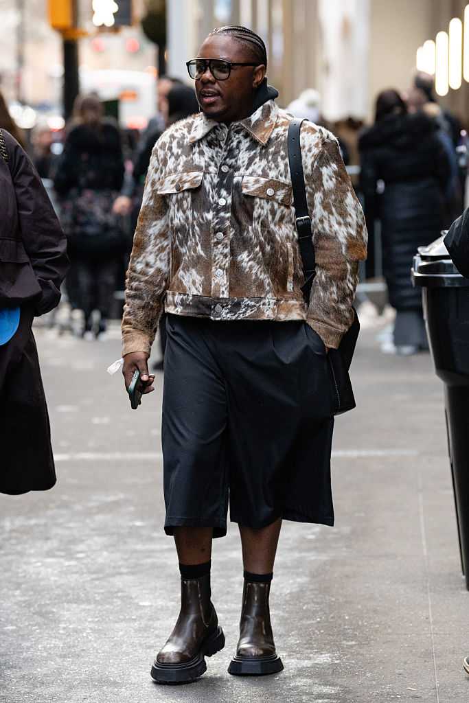 One of the best parts of New York Fashion Week is all of the amazing street style, like this guest who pairs a leather jacket, animal print skirt and black stilettos for the Ralph Lauren show.