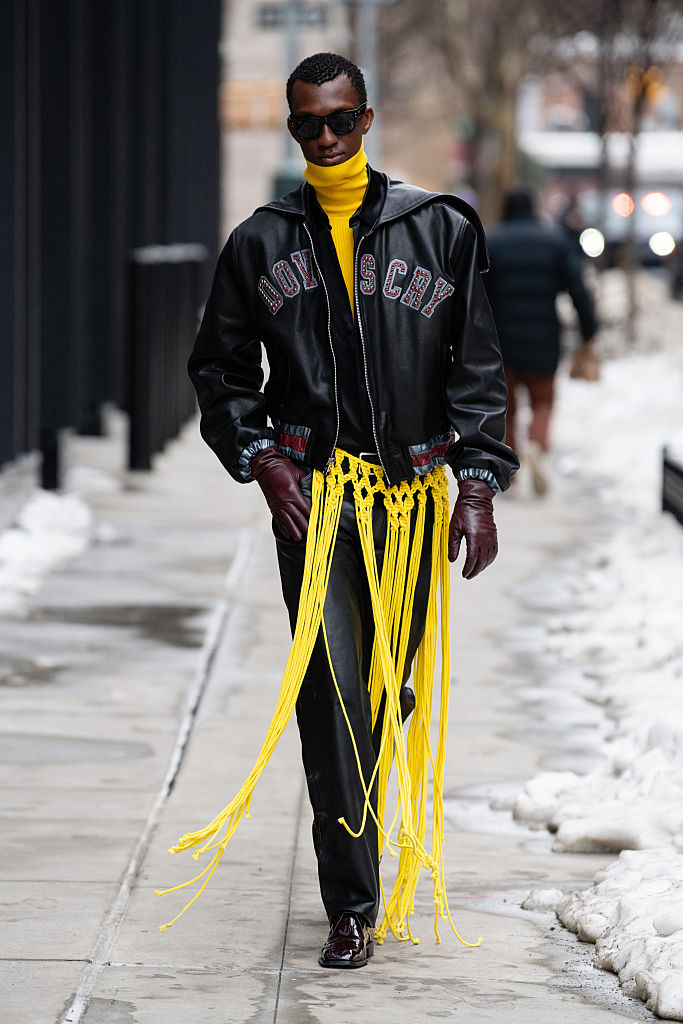 The yellow fringe adds a perfect pop of color to this all black look spotted outside of Proenza Schouler.