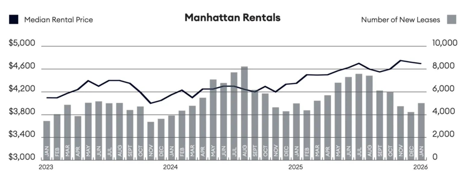 While January is normally the best time to find deals on apartments, New Yorkers continued to face record-high rents in the first month of 2026. In January, the Manhattan median rent hit $4,695/month, according to the monthly rental report prepared by Miller Samuel for Douglas Elliman. While the price is down slightly from December, which saw median rents for the borough at $4,720, January marked the third-highest rent on record for Manhattan.