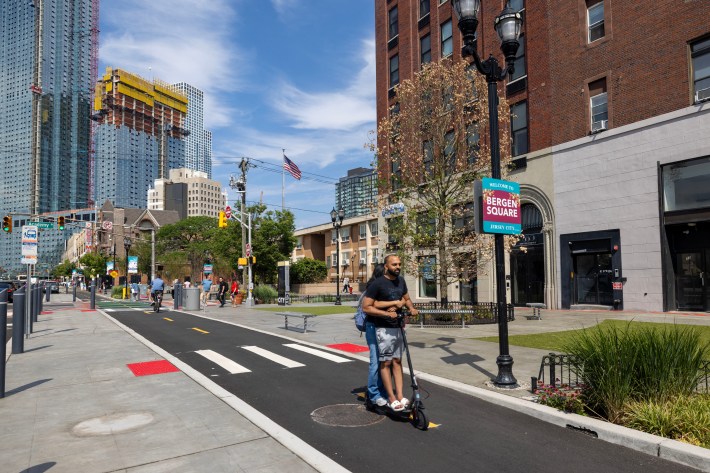 The crown jewel that Patel and safe streets boosters mentioned over and over was the redesign of Bergen Square. The city turned the forlorn crossing, dominated by surface parking lots, into green space with benches and tables, bus shelters, a raised two-way bike lane and bike racks.