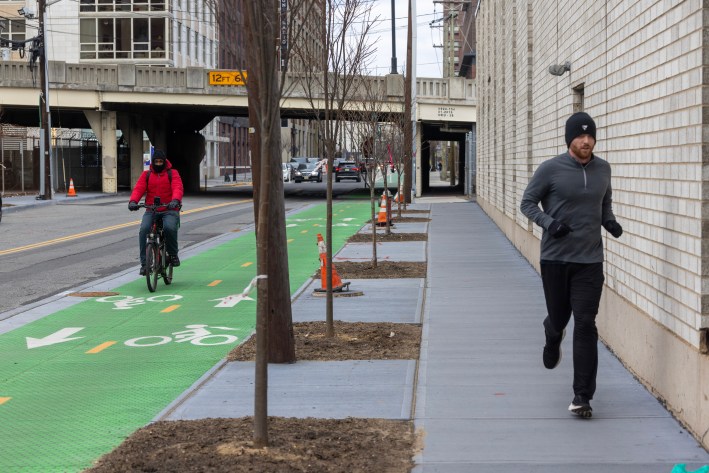 The Coles Street bike lanes rival bike infrastructure in bike capitals of Europe. Jennifer Brown/City of Jersey City