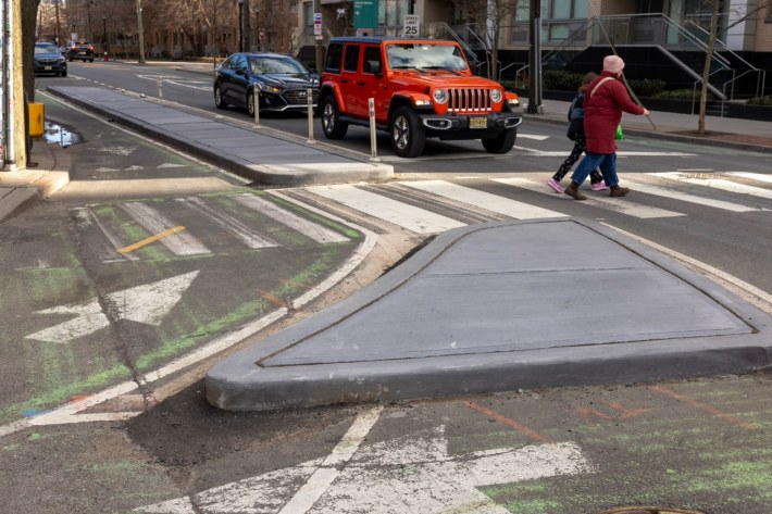 The city also pioneered safe intersections — which are usually the most dangerous part of a street — by installing concrete buffers at corners like Grove and Grand Streets.