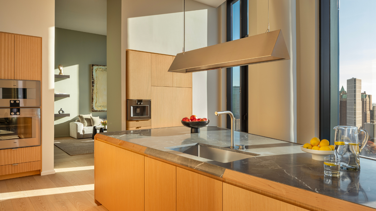 The penthouse, located on the 32nd floor, spans 4,928 square feet. It includes five bedrooms, a separate home office, and four-and-a-half bathrooms. The residence offers 360-degree views and a private 552-square-foot terrace. The design of the penthouse was completed by IMG.