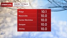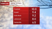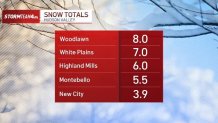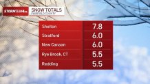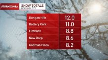 Here’s a look at snow totals from around New York, New Jersey and Connecticut (updated as of 12 a.m. Monday):
