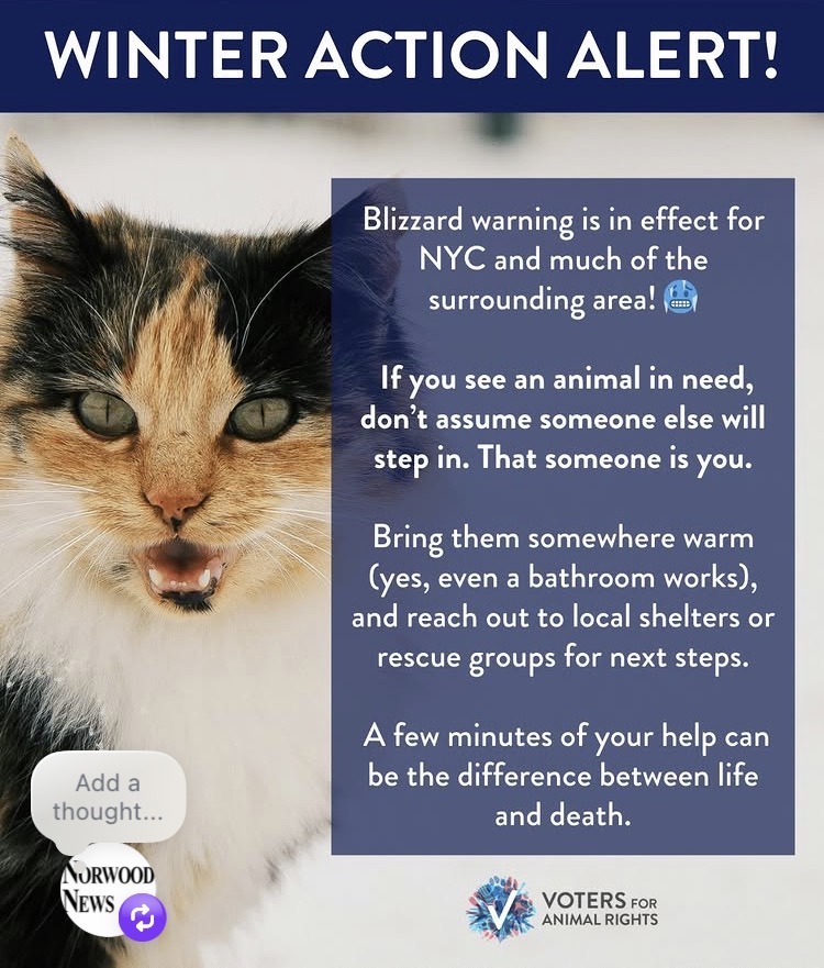 A PUBLIC SERVICE announcement regarding animal protection amid the prevailing snowstorm