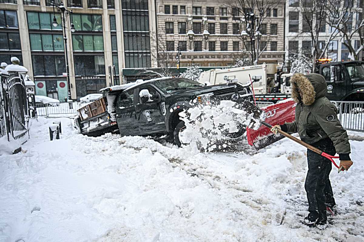An NYC Parks Department snowplow fell through a sidewalk sinkhole just outside City Hall on Monday afternoon as the city works to recover from the Blizzard of 2026.